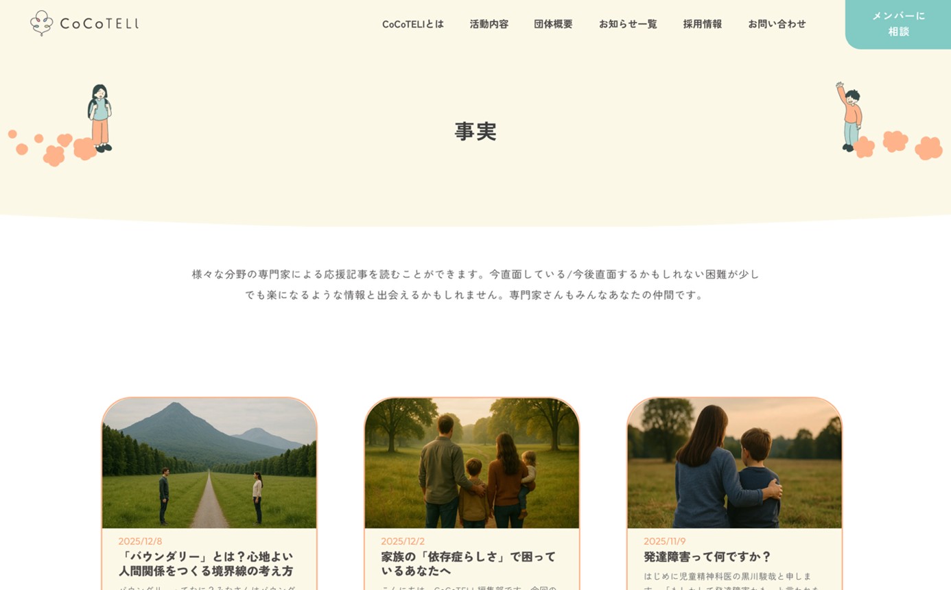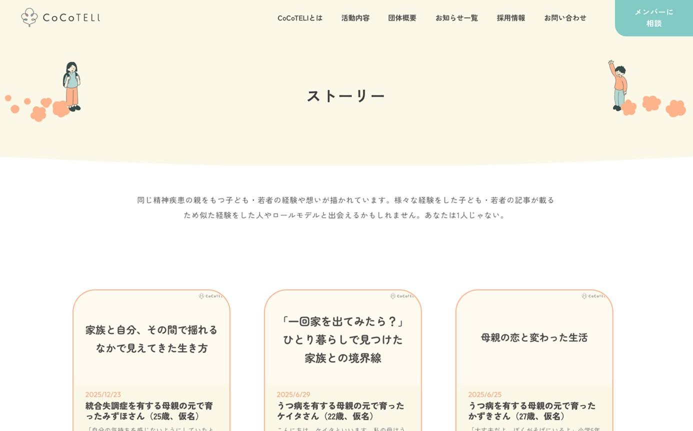 発信が親子の対立構造を助長し得るため、精神疾患を有する親の立場の方に執筆していただく記事を企画・公開した( https://cocoteli.com/facts/kosodate )。